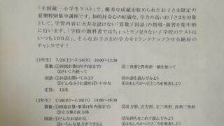 ちなみに夏季特別講習は、基本的に全国統一小学生テストを受験した校舎でしか受けられないようです。全国統一小学生テストを四谷大塚の校舎で受けていないと、成績が優秀でも夏季特別講習の招待は届かないかもしれません。