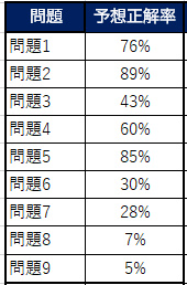 アンケートから推定した問題ごとの正解率は下表の通りです。